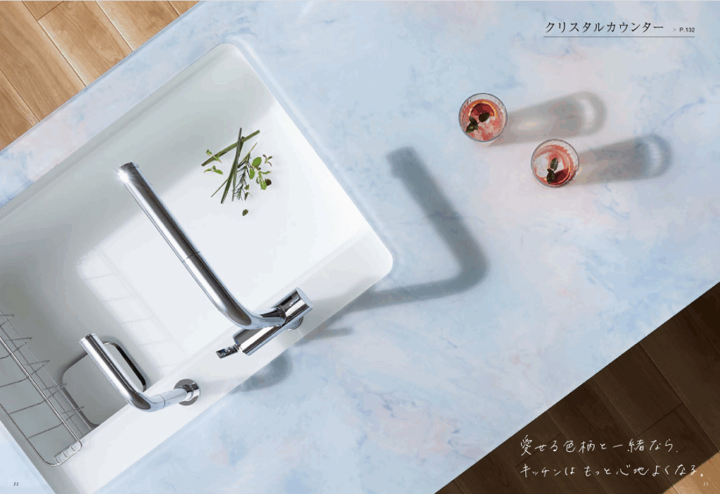 クリスタルカウンターや豊富な扉カラーを選べる分、「デザイン重視」で決めてしまいがちです。透明感や高級感は魅力ですが、実際の使い勝手や手入れのしやすさも確認しておかないと、見た目と実用性のギャップで後悔することがあります。